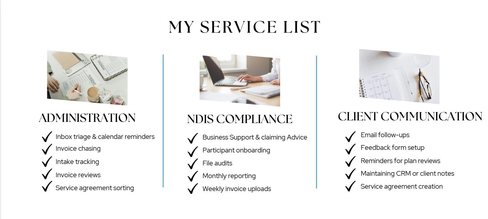 You can think of me as your business Sidekick, your go-to Gal, Your organiser and Chaos manager. I am here for you to sort your NDIS business and lighten your load.